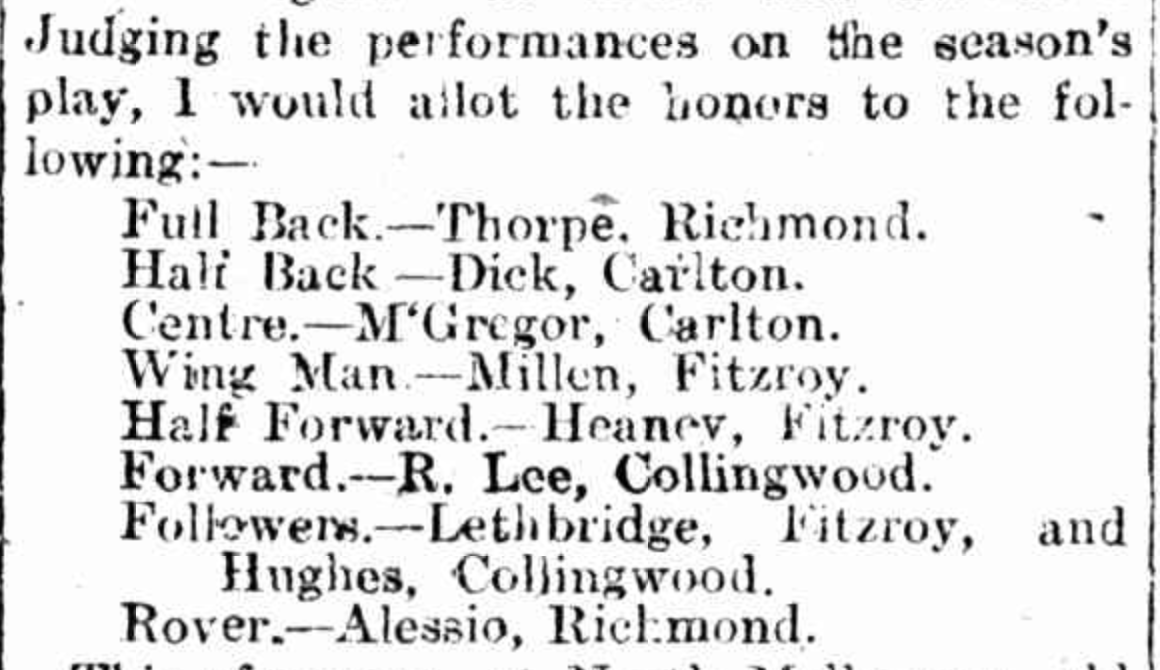 The Argus: "Two of the best men on the Richmond side were comparatively new, Hede who played one or two game last season, showing fine form on the wing. A young rover named Alessio , a son of the old North Melbourne player, distinguished himself"