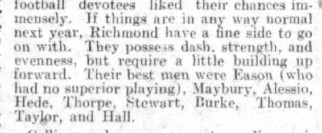 "Their (Richmond) best men were Eason (who had no superior playing), Maybury, Alessio, Hede, Thorp, Stewart, Burke, Thomas, Taylor , Hall."