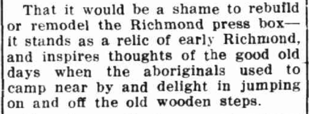 Discussions are underway to improve the press-box at the Punt Road Ground. The Richmond Guardian writes it would be a shame if it was dismantled as “it stands as a relic of early Richmond and inspires thoughts of the good old days when the aboriginals used to camp near by and delight in jumping on and off the old wooden steps.”